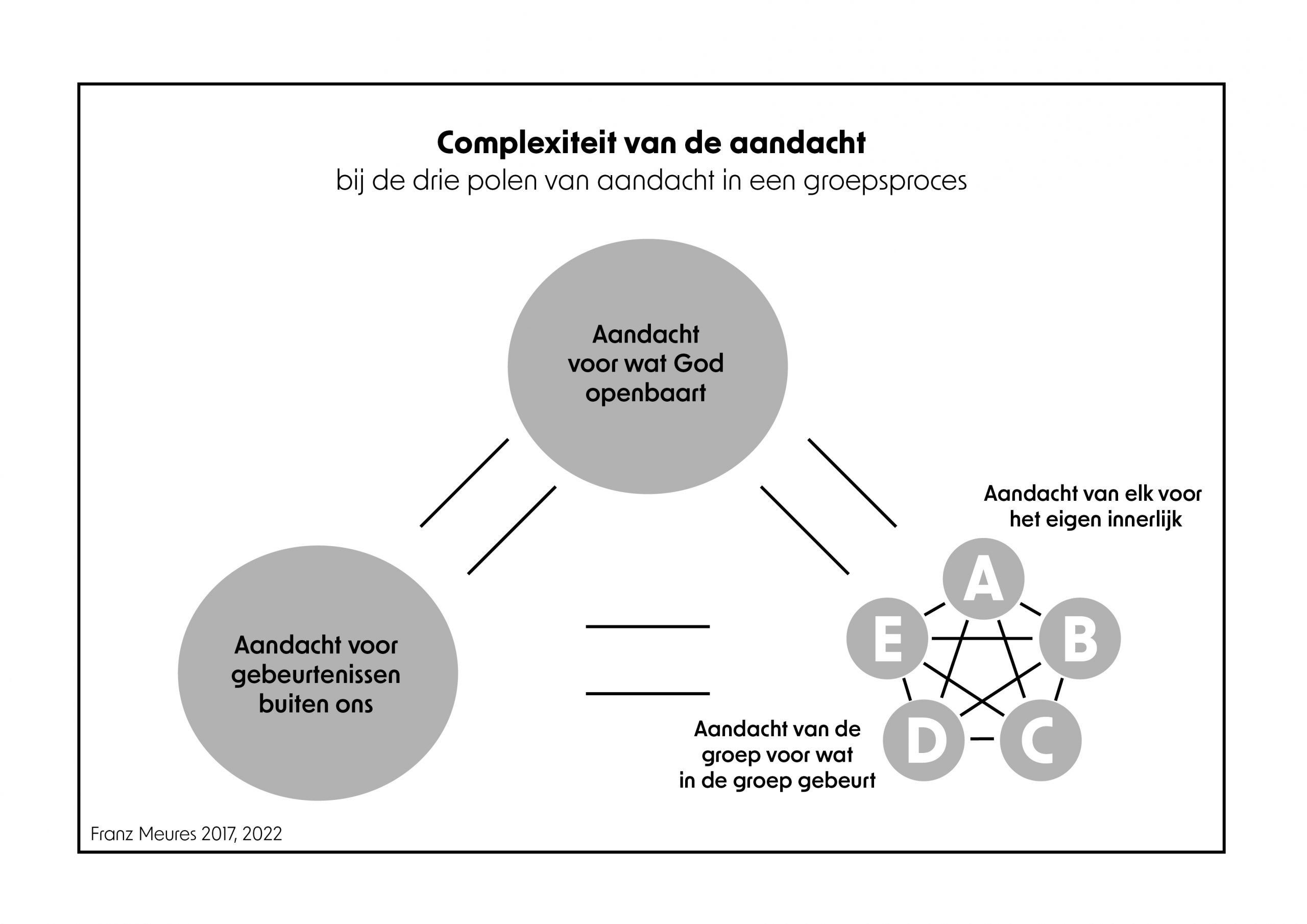 Geestelijke processen bij gemeenschappen, groepen en andere vormen van bijeenzijn verlopen analoog met het geestelijk proces bij de individuele persoon. Dat betekent niet dat bij beraadslagingen de methode zonder meer verandert. Integendeel, het gaat op de eerste plaats om de vraag, of de deelnemers aan de beraadslagingen bereid zijn in alle ernst naar de wil van God te vragen en zich door Hem te laten leiden. Als een bisdom een veranderingsproces als een geestelijk proces vorm wil geven is dit een geloofsexperiment van de hoogste rang. Veel regelgevingen en zakelijke verordeningen van kerkelijke gremia uit de laatste vijftig jaar, regelen hoe een proces van meningsvorming met hoge deelname van alle betrokkenen gestructureerd tot stand kan komen. In wezen gaat het daarbij om de vraag of wij als groep, als gremium, als bisdom met een hoge participatie kunnen zeggen wat we willen. Om hoe we iets tot stand willen brengen. Heel vaak ontbreekt daarin die elementaire tweede beweging van een geestelijk proces, te weten: hoe vinden we wat God van ons wil in een gegeven situatie? Bij het geestelijk proces gaat het om een tweevoudige blikrichting: “Wat willen wij?” en tegelijk “Wat wil God?” Sommige ordes en gemeenschappen hebben een vorm van geestelijk zoekproces in hun basisteksten neergelegd. Toch is hiervan in vele kerkelijke regelgevingen en zakelijke verordeningen nauwelijks iets te vinden. In het beste geval resulteert dit in een opnieuw vastleggen van deze verordeningen. Maar dan is het wel nodig dat alle deelnemers bereid zijn om die geestelijke weg werkelijk te gaan. Veel regelgevingen gaan ervan uit dat de leden van een gremium zich houden aan de gangbare democratische spelregels, zoals een meerderheidsbesluit accepteren ook al hou je er zelf een andere mening op na. Ook voor een geestelijk beslissingsproces is het van elementair belang dat allen zoveel mogelijk de intentie hebben om gezamenlijk te zoeken naar wat in de gegeven situatie meer aan de wil van God zou kunnen beantwoorden. Om als groep of gremium tot een geestelijke beslissing te komen is er ook aandacht voor de drie polen nodig. Maar dan wordt het geheel veel gecompliceerder. In groep is het immers niet eenvoudig om gemeenschappelijke waarnemingen onder woorden te brengen, tot gemeenschappelijke inschattingen te komen en zich samen door het woord van God te laten leiden. Het model daartoe zou er als volgt kunnen uitzien: